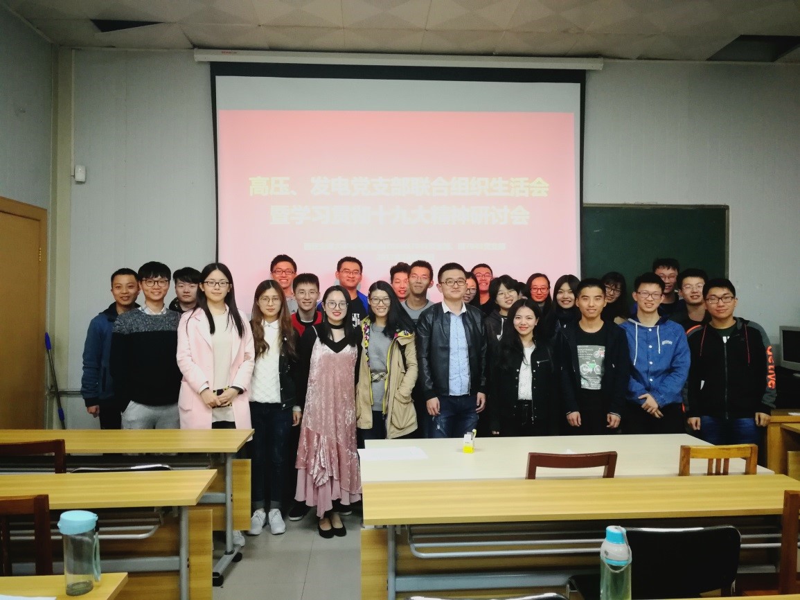 2017年10月24日晚,硕7039/41班党支部和7043班党支部在高电压技术教研室联合举行了主题为“学习贯彻十九大精神”的组织生活会。